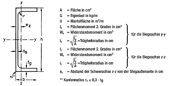 | Bezeichnung | Abmessungen | A cm2 | G kg/m | U kg/m | Für die Biegeachse | ez cm | ||||||||||